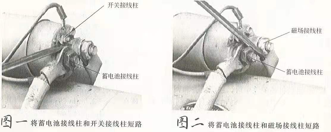 6.用旋具再將蓄電池接線柱和磁場接線柱短路。若啟動(dòng)機(jī)正常運(yùn)轉(zhuǎn),則說明電磁開關(guān)內(nèi)部有故障,應(yīng)拆下電磁開關(guān),檢查電磁開關(guān)內(nèi)部的活動(dòng)觸頭和兩個(gè)靜觸頭的燒損情況及磁力線圈是否燒損等。如啟動(dòng)機(jī)仍不運(yùn)轉(zhuǎn),且在短路時(shí)無火花出現(xiàn),則說明啟動(dòng)機(jī)內(nèi)部出現(xiàn)斷路故障;若火花出現(xiàn),則說明啟動(dòng)機(jī)內(nèi)部出現(xiàn)短路現(xiàn)象,應(yīng)將啟動(dòng)機(jī)拆下后進(jìn)行修理。