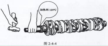 1.曲軸正時齒輪與曲軸小頭端采用過盈配合,安裝時用電磁感應(yīng)加熱器(或其它方式)將曲軸正時齒輪加熱到120 0C左右,根據(jù)各種機(jī)型曲軸的不同定位要求,銷釘定位有:YC6105ZLQ、YC6108ZLQB、YC6L。屬鍵定位有:YC4110、YC4112、YC6105QC、YC6108QC。靠工裝定位的有YC6112機(jī))迅速將加熱后的曲齒裝入曲軸小頭端,保證把齒輪壓到臺肩貼合。如圖2-4-4。